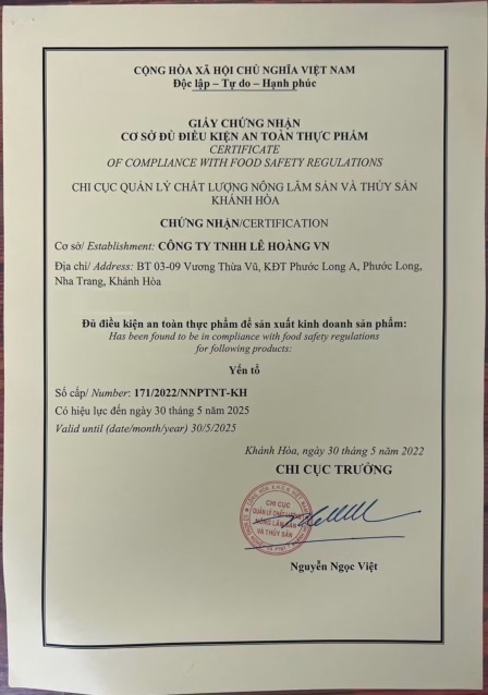 Công ty TNHH Lê Hoàng – Chủ sở hữu thương hiệu Yến sào Ngự Hoàng là công ty hoạt động chuyên sâu trong các lĩnh vực Kinh doanh nông sản, thực phẩm thiên nhiên, chăm sóc tư vấn sức khỏe. Cty có lịch sử phát triển và sở hữu nhiều nhà yến, xưởng chế biến và tham gia vào các công đoạn từ nuôi dưỡng đến thành phẩm, đảm bảo kiểm soát chặt chẽ quy trình và chất lượng sản phẩm, điều mà không nhiều doanh nghiệp có được.
