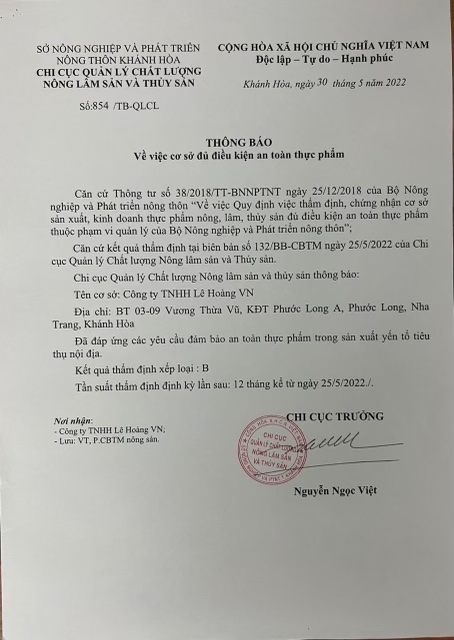 Ngự Hoàng có đầy đủ giấy tờ chứng nhận về an toàn thực phẩm